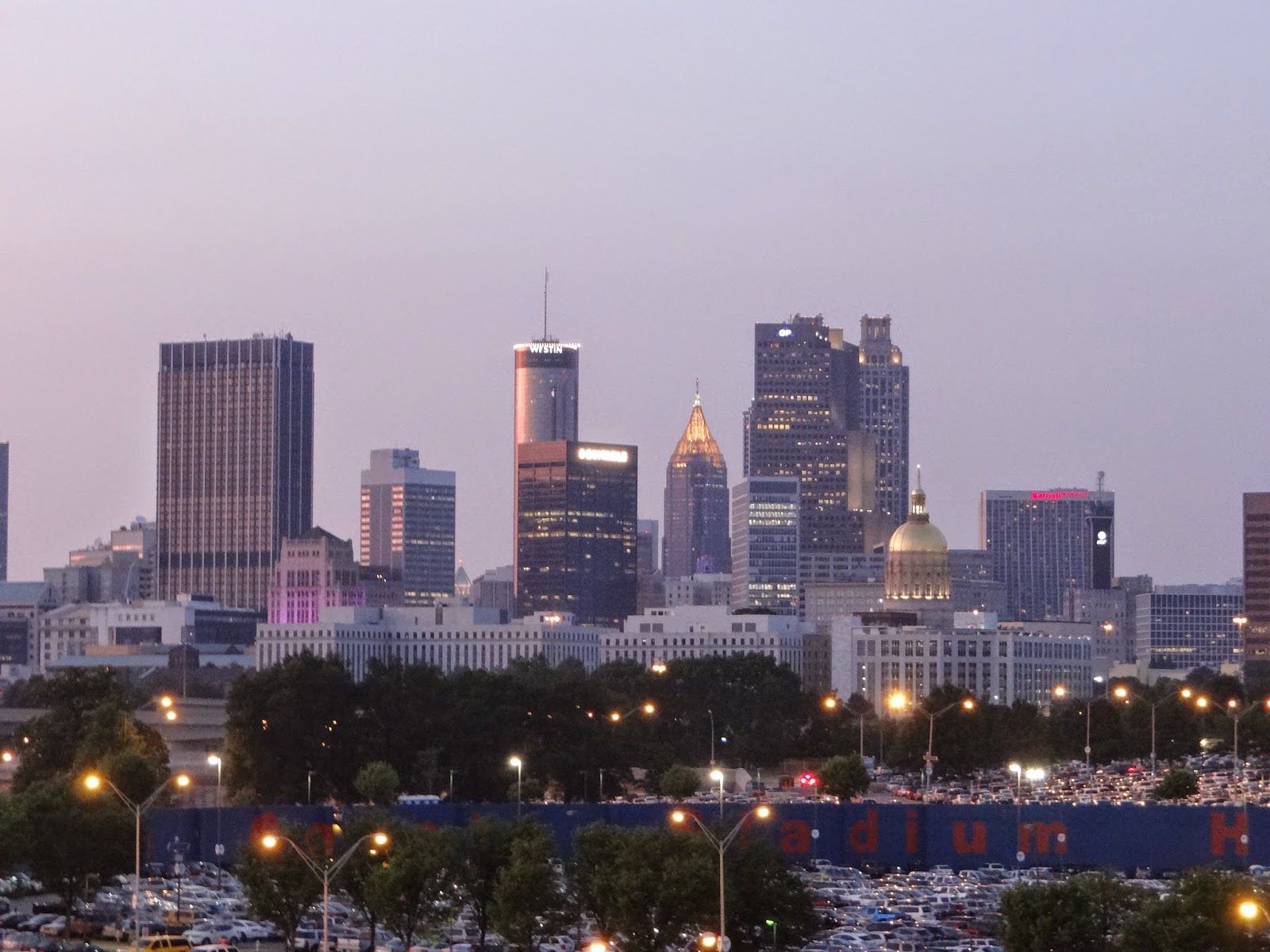 Another cool aspect about Turner Field was that they had a deck in left field that looked out onto the Atlanta skyline. Robbie noticed that the sun was setting and he mentioned going over to watch, and to our surprise, there was the skyline! We watched the sun go down as the lights were coming on downtown, and we even saw the 1996 Olympic Cauldron to the east of downtown. That was neat!